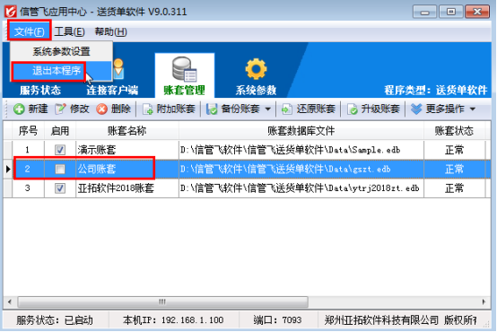 亞拓軟件旗下的信管飛RMS信管飛倉庫管理軟件信管飛送貨單軟件信管飛出納記賬軟件信管飛票據打印軟件等軟件程序安裝后會顯示兩個圖標,一個是應用中心程序(紅色圖標),一個是客戶端程序(藍色圖標)。這些軟件都含有賬套管理功能,在應用中心里面可以建立多個賬套,已使用的帳套如果不再繼續使用,可以停用帳套,停用帳套后,客戶端程序登錄時無法連接該帳套。我們以信管飛送貨單軟件為例演示一下如何停用帳套。