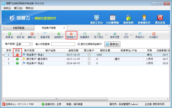 信管飛財務(wù)出納記賬軟件可以同時建立多個資金賬戶,進(jìn)行管理多個資金賬戶賬目,在實際業(yè)務(wù)需求中可能會出現(xiàn)資金賬戶變動,需要停用之前賬戶及設(shè)置在出納日記賬中不顯示此賬戶,我們以“信管飛出納記賬軟件專業(yè)版”為例示范下如何停用資金賬戶及設(shè)置不顯示。