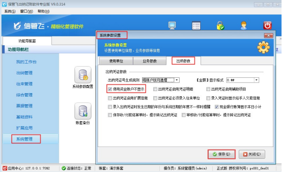 在功能導(dǎo)航窗選擇“系統(tǒng)管理”—》“系統(tǒng)參數(shù)配置”—》“出納參數(shù)”,在“出納參數(shù)”界面把“停用資金賬戶不顯示”勾選啟用,然后保存參數(shù)配置,如下圖2所示: