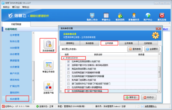 在功能導航窗點擊“系統(tǒng)管理”—》“系統(tǒng)參數(shù)配置”—》“業(yè)務參數(shù)”,即可進入到“業(yè)務參數(shù)”配置界面,在數(shù)據(jù)選擇參數(shù)內(nèi)打鉤啟用“在選擇商品窗口顯示客戶相關(guān)商品”參數(shù),然后點擊“保存”按鈕保存設(shè)置,如下圖2所示: