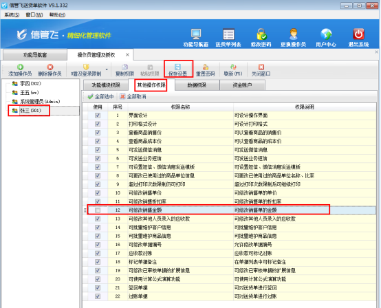 信管飛送貨單軟件、信管飛RMS、信管飛倉庫管理軟件等默認開單時金額信息允許修改,為了避免操作員開單時出現金額修改錯誤情況,軟件支持設置操作員不可修改銷售金額的權限。以“信管飛送貨單軟件”為例,講一下如何設置操作員不可修改銷售金額。