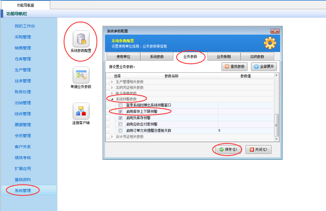 在功能導航窗點擊“系統管理”—》“系統參數設置”—》“業務參數”,即可進入到“業務參數”配置界面,在系統預警參數內將“啟用庫存上下限預警”參數啟用一下,設置完成后點擊“保存”按鈕保存配置,如下圖所示。