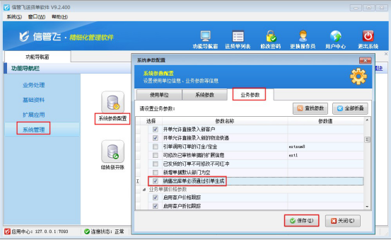 在功能導航窗選擇“系統管理”—》“系統參數配置”在業務參數的“業務單據相關參數”中勾選啟用參數“銷售出庫單必須通過引單生成”,保存參數配置,如下圖所示: