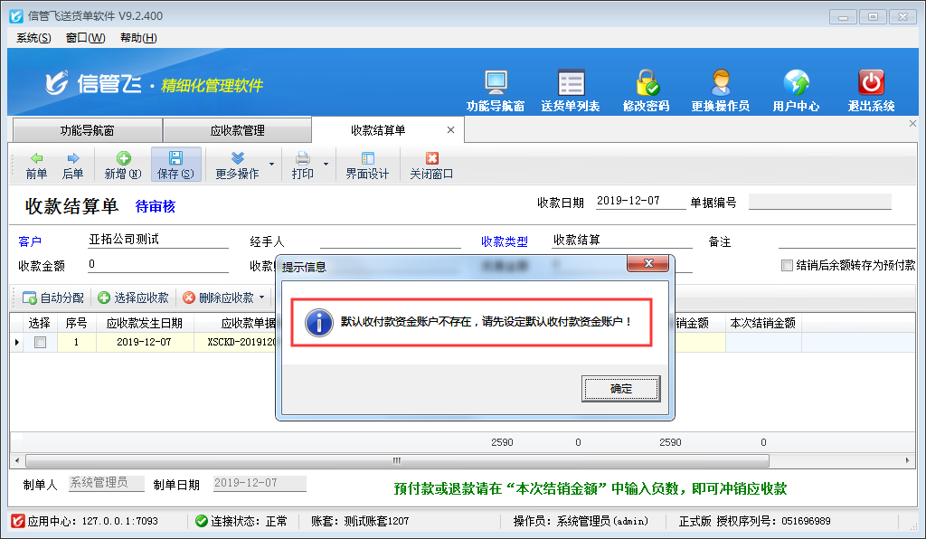 收款結算單用來登記收款信息(收款對象即客戶、收款賬戶、收款金額、經手人等),并結銷應收款記錄。部分用戶在剛開始使用送貨單軟件對軟件功能不熟悉,首次對應收款進行收款結算,錄入收款金額時會提示:默認收付款資金賬戶不存在,請先設定默認收付款資金賬戶!(如下圖所示)無法繼續填開收款結算單。