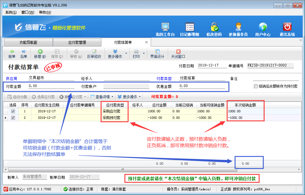 注意:付款結算單單據明細中“本次結銷金額”的合計金額,必須等于可結銷金額(付款金額 + 優惠金額),否則無法保存付款結算單。