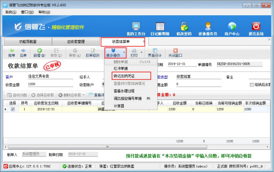 出納記賬軟件支持新增客戶的應收款記錄,方便后期對賬。在功能導航窗打開“往來管理”—》“應收款管理”,選擇一個未結銷的應收款,點擊工具欄的“收款結算”按鈕,進入收款結算單界面。在收款結算單界面正常進行收款操作,保存或者審核收款結算單后,在“更多操作”下點擊“轉記出納憑證”會彈出出納憑證新增界面,如下圖所示: