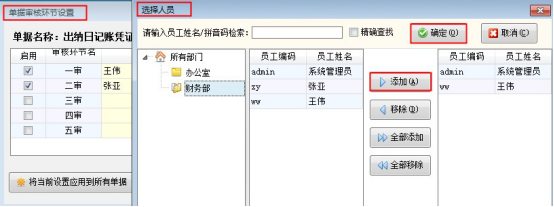 二、多級(jí)審核功能的配置在功能導(dǎo)航窗,點(diǎn)擊“系統(tǒng)管理”—》“系統(tǒng)參數(shù)配置”—》“出納參數(shù)”中勾選啟用“出納憑證啟用多級(jí)審核”,點(diǎn)擊右邊文本框的“...”處,進(jìn)入單據(jù)審核環(huán)節(jié)設(shè)置,如下圖所示,對(duì)出納日記賬憑證進(jìn)行了二級(jí)審核的設(shè)置,一審操作員是“王偉”,二審操作員是“張亞”。