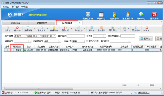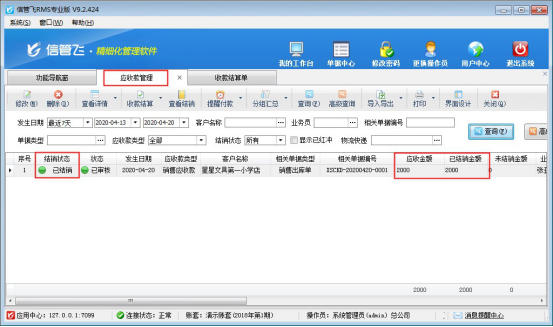 收款結算單單據保存并審核之后,更新應收款的結銷狀態,在應收款管理界面可以查看應收款結銷情況,如下圖所示,客戶“星星文具第一小學店”應收金額2000元已結銷,未結銷金額為0。