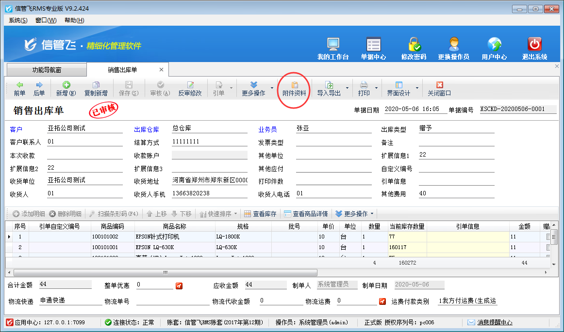 操作員權限設置完成后,選擇操作員“張亞”登錄軟件,打開一個銷售出庫單,然后可以看到銷售出庫單界面工具欄已查看不到“附件資料”功能,操作員將無法再查看附件資料。