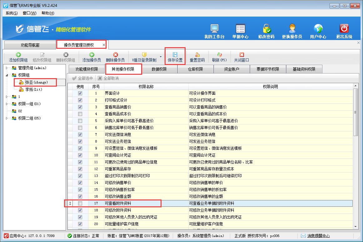 在功能導航窗點擊“系統(tǒng)管理”—》“操作員及授權”打開操作員管理及授權界面,選擇操作員“張亞”,在“其他操作權限”中把權限“可查看附件資料”勾選取消,然后點擊“保存設置”按鈕保存權限設置,如下圖所示: