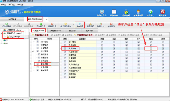 在功能導航窗點擊“系統管理”—》“操作員及授權”打開操作員管理及授權界面,選擇操作員“張亞”,在功能模塊權限界面,選擇“基礎資料”—》“客戶信息”,在導出權限下,把客戶信息“導出”權限勾選取消后保存權限,如下圖1所示: