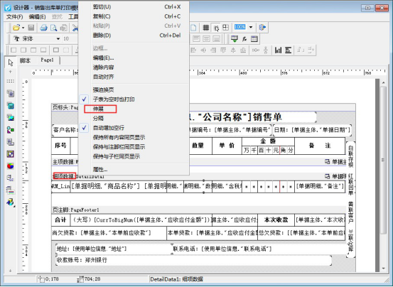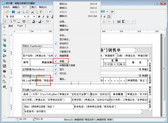 在開單界面,打印按鈕下點擊“打印格式設計”,在打印格式設計界面,點擊“設計格式”,可進入模板設計器界面,首先點擊文本框,點擊鼠標右鍵可設置下自動折行,然后把單據明細中的文本框點擊后鼠標右鍵把“伸展”勾選上,如下圖所示: