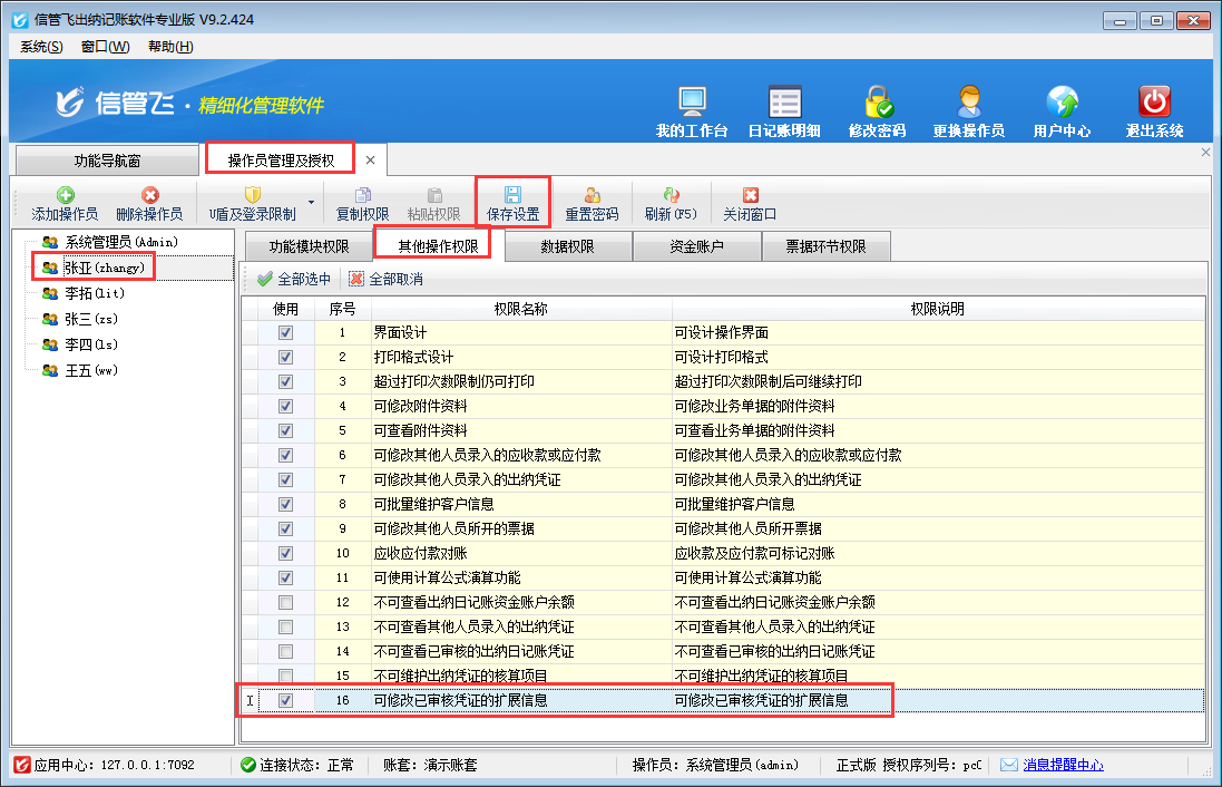 在功能導(dǎo)航窗點“系統(tǒng)管理”→“操作員及授權(quán)”即可進(jìn)入“操作員管理及授權(quán)”界面,選中操作員賬號,在“其他操作權(quán)限”界面將“可修改已審核憑證的擴(kuò)展信息”權(quán)限勾選上,然后保存權(quán)限設(shè)置即可。如下圖所示,設(shè)置操作員賬號“張亞”可修改已審核憑證的擴(kuò)展信息。