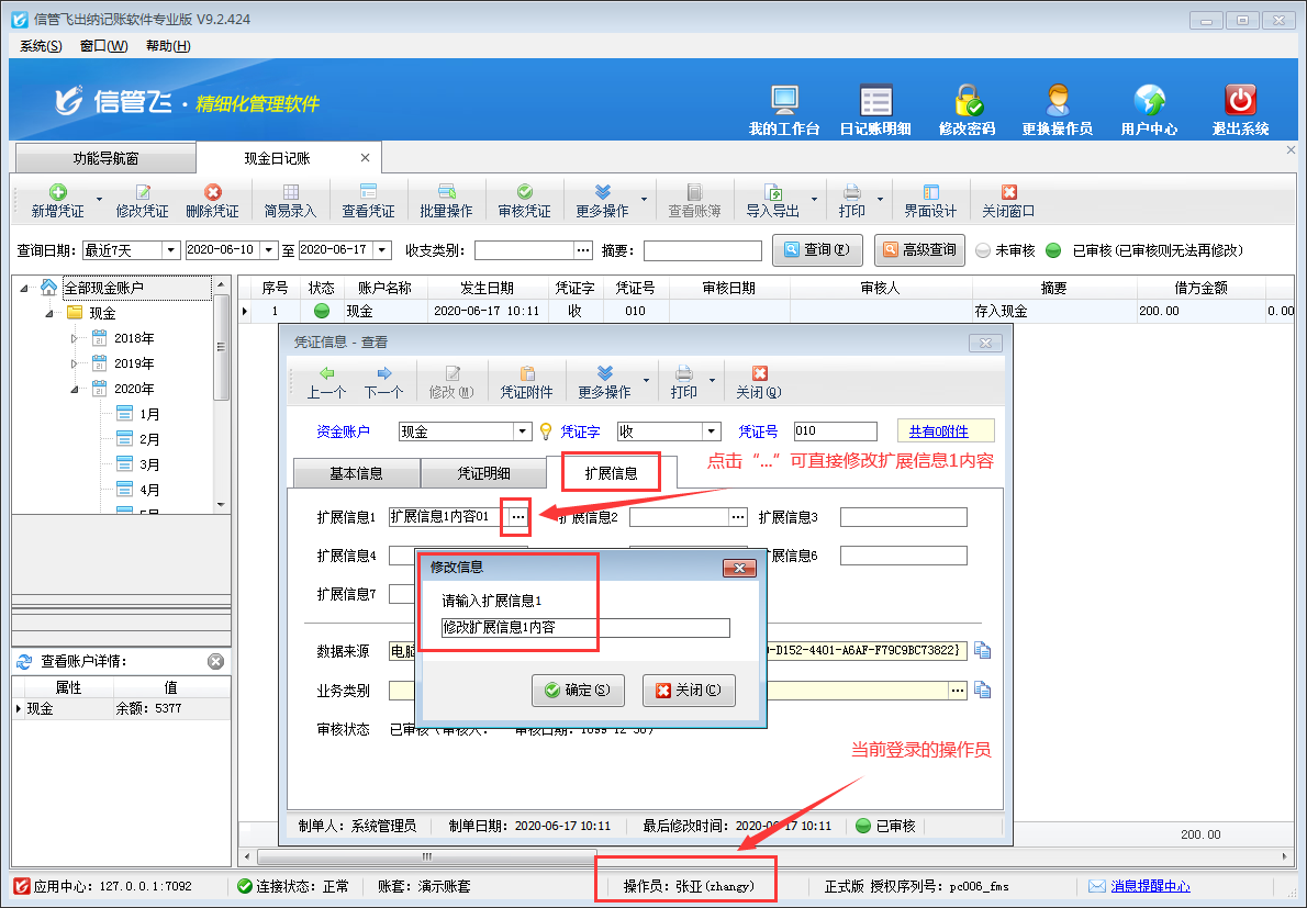 設(shè)置完成之后,我們使用操作員賬號“張亞”登陸軟件,然后在功能導(dǎo)航窗點擊“出納管理”→“現(xiàn)金日記賬”,打開一個已審核的現(xiàn)金日記賬憑證,然后點擊擴(kuò)展信息頁面,在“擴(kuò)展信息1”后的“...”按鈕可以直接修改擴(kuò)展信息內(nèi)容,如下圖所示: