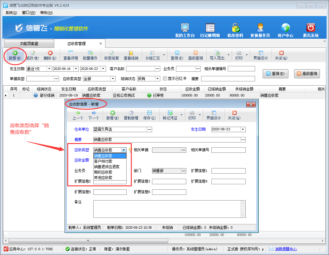 在功能導(dǎo)航窗點(diǎn)擊“往來管理”—》“應(yīng)收款管理”,即可打開應(yīng)收款管理界面,在工具欄點(diǎn)擊“新增”按鈕,系統(tǒng)打開新增應(yīng)收款窗口,如下圖所示,“應(yīng)收類型”選擇為“銷售應(yīng)收款”,然后錄入應(yīng)收金額及其他數(shù)據(jù)后保存此應(yīng)收款信息即可。