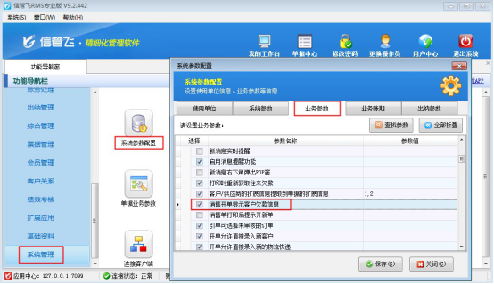 在功能導(dǎo)航窗點擊“系統(tǒng)管理”—》“系統(tǒng)參數(shù)配置”—》“業(yè)務(wù)參數(shù)”,即可進入到“業(yè)務(wù)參數(shù)”配置界面,在業(yè)務(wù)單據(jù)相關(guān)參數(shù)內(nèi)打鉤啟用“銷售開單顯示客戶欠款信息”參數(shù),然后保存,如下圖所示: