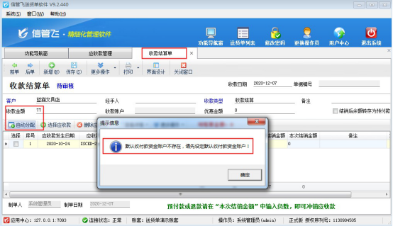 信管飛送貨單軟件是一款集開單送貨和應(yīng)收款管理的軟件,軟件開單后可對(duì)開單生成對(duì)應(yīng)的應(yīng)收款進(jìn)行收款結(jié)算,有客戶開收款結(jié)算單時(shí)候,輸入收款金額點(diǎn)擊保存會(huì)提示“默認(rèn)收付款資金賬戶不存在,請(qǐng)先設(shè)定默認(rèn)收付款資金賬戶!”,無(wú)法保存單據(jù),如下圖所示: