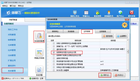 在功能導航窗點擊“系統管理”—》“系統參數配置”選擇“業務參數”,勾選“特殊功能數”下的“結算單按月顯示應收應付款”,然后保存設置,如下圖所示: