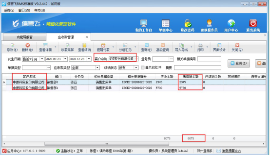 參數設置完成后,功能導航窗點擊“往來管理”—》“應收款管理”可查看所有應收款記錄。選擇示例客戶“中原科貿股份有限公司”匯總其應收款,可看到有10月兩筆待結銷應收款記錄。總金額為:8075元,如下圖所示: