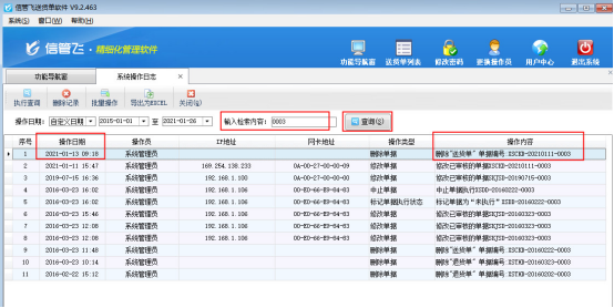 在系統(tǒng)操作日志界面,可以根據(jù)操作日期、檢索內容等條件進行查詢。以缺少的單號“0003”為例,輸入檢索內容“0003”后點擊“查詢”按鈕,可以看到單號0003被刪除的刪除記錄。如下圖3所示: