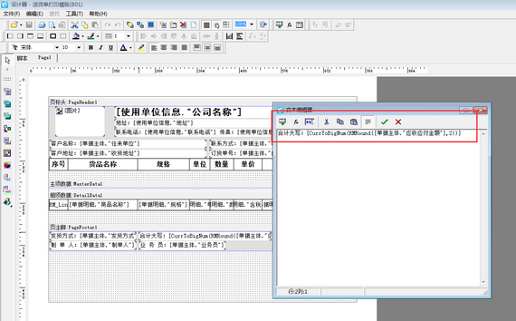 打開模版設計界面后,在模版合適的位置添加一個文本框,雙擊文本框打開文本編輯器,然后錄入內容“[CurrToBigNum([RMRound([單據主體."應收應付金額"],2)])]”或者是通過“插入表達式”插入數字轉換人民幣大寫函數,如下圖所示。