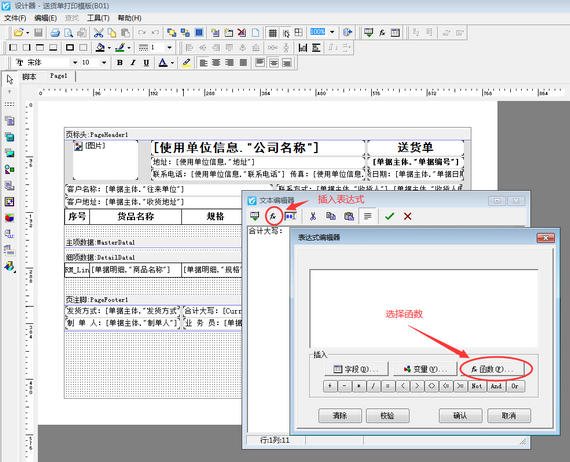 打開一個已保存的送貨單,然后在單據界面點擊“打印”—“打印格式設計”按鈕,進入“送貨單打印格式設計”界面,以內置模板(B01)為例,選擇打印格式模版(B01),然后點擊“設計格式”按鈕進入模版設計器界面,如下圖所示。