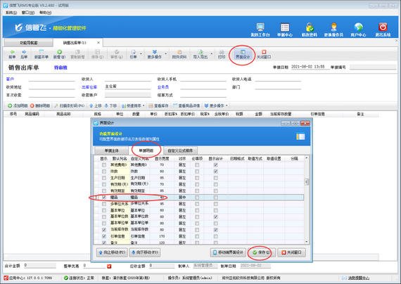 首先打開銷售出庫單開單界面,如下圖所示,軟件默認不顯示“贈品”項,需要先通過界面設計配置將“贈品”項勾選顯示出來。在工具欄點擊“界面設計”—》“單據明細”,找到“贈品”項,將其勾選顯示出來,然后點擊“保存”按鈕保存設置。