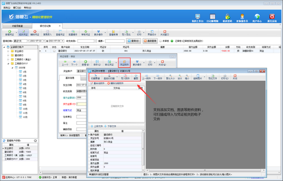 信管飛出納記賬軟件新增或者修改日記賬憑證時,支持添加文檔、圖表等附件資料,可掃描或導入與日記賬憑證相關的電子文件,方便用戶更全面、直接地查詢日記賬發生的全過程,有利于企業對內部流水賬的管理(如下圖所示)。