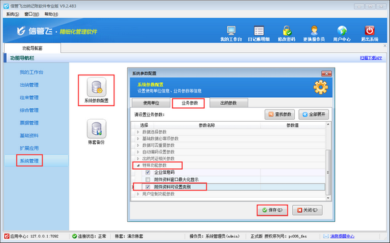 在功能導航窗點擊“系統管理”—》“系統參數配置”—》“業務參數”打開業務參數配置界面,然后在特殊功能參數中可以找到“附件資料可設置類別”參數,勾選啟用此參數,然后點擊“保存”按鈕保存參數配置,如下圖所示。