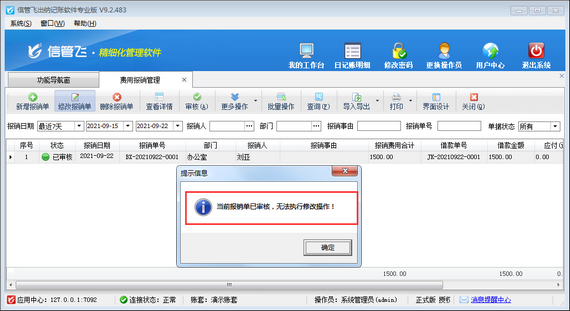 費用報銷單保存審核后默認不允許直接修改,如下圖所示,但是部分客戶需要對已審核的費用報銷單進行修改,軟件支持反審費用報銷單功能。本篇文章介紹一下出納記賬軟件中已審核的費用報銷單如何反審修改?