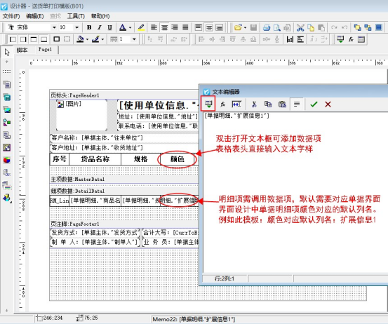 文本框添加完成后,雙擊打開文本框進行添加數據,表頭文本框打開輸入文字“顏色”,明細項文本框調用數據項“[單據明細."擴展信息1"]”,如下圖所示: