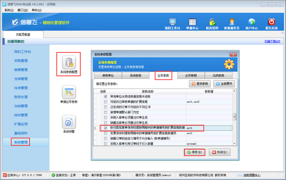 在功能導航窗選擇“系統管理”—》“系統參數配置”—》“業務參數”,進入業務參數設置界面,在“業務單據相關參數”中勾選“收付款結算單保存時提取明細中的單據編號到擴展信息數據項”參數,并設置參數值,默認為ext1(擴展信息1),然后保存參數配置,如下圖所示。