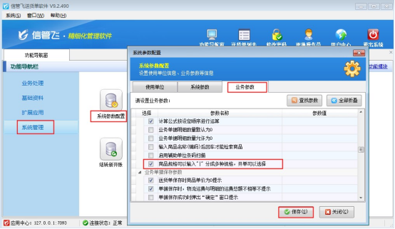 在功能導航窗點擊“系統管理”—》“系統參數配置”,勾選啟用“業務參數”中的“商品規格可以輸入”|“分成多種規格,開單可以選擇”參數。如下圖所示: