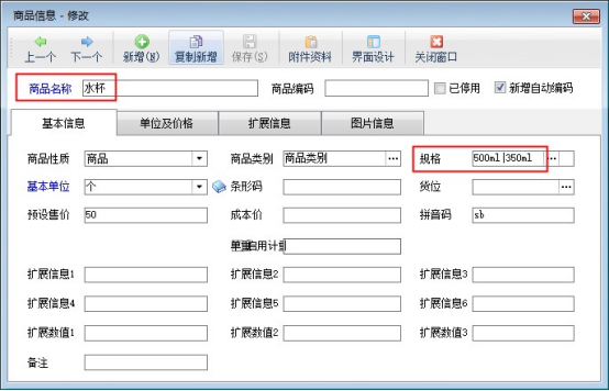參數啟用保存后,在“基礎資料”—》“商品信息”中可添加商品,在規格中可區別開規格內容,示例商品:水杯(規格500ml和350ml),如下圖所示
