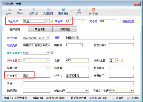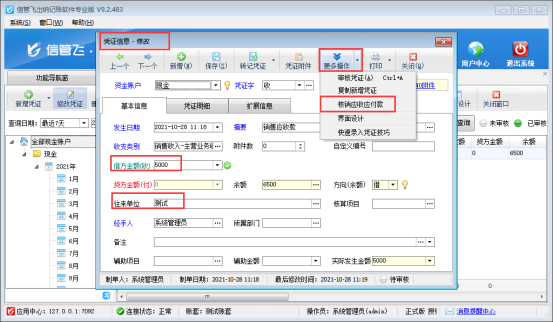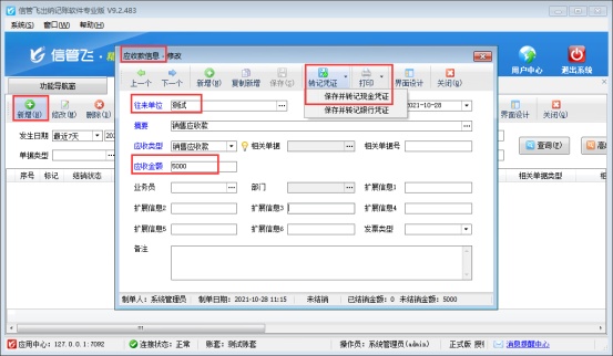 功能導(dǎo)航窗“往來管理”—》“應(yīng)收款管理”中,新增一筆客戶“測(cè)試”的應(yīng)收款記錄,應(yīng)收金額5000元,保存并轉(zhuǎn)記現(xiàn)金憑證,如下圖所示: