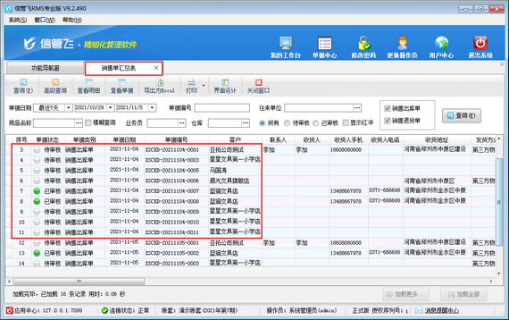 信管飛RMS軟件默認開單保存后即可生成單據編號,即可打印。有些客戶進行對賬時發現單據已打印,但在軟件的單據匯總表中查不到此單,此種情況可能是單據被誤刪了。如下圖為例,銷售單匯總表中,2021年11月4日缺少單號“0002”、“0004”,那么該如何補錄這些單據?下面我們以信管飛RMS軟件專業版,補錄“0002”單據為例,演示一下誤刪單據后如何補錄單據?