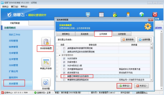 在功能導(dǎo)航窗點擊“系統(tǒng)管理”—》“系統(tǒng)參數(shù)配置”選擇“業(yè)務(wù)參數(shù)”,找到參數(shù)“銷售訂單審核允許負(fù)庫存”取消勾選,然后保存配置,如下圖所示: