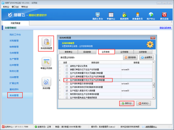 在功能導(dǎo)航窗點(diǎn)擊“系統(tǒng)管理”—》“系統(tǒng)參數(shù)配置”—》“業(yè)務(wù)參數(shù)”打開(kāi)業(yè)務(wù)參數(shù)配置界面,在生產(chǎn)管理相關(guān)參數(shù)中打鉤啟用“生產(chǎn)領(lǐng)料單數(shù)量不可大于生產(chǎn)任務(wù)單數(shù)量”參數(shù),如下圖所示。