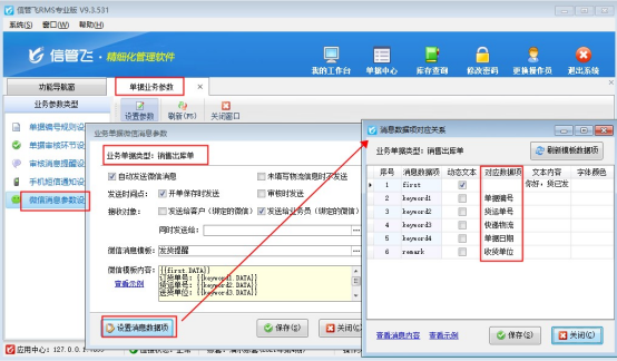 功能導航窗點擊“系統管理”—》“單據業務參數”,選擇“微信消息參數設置”,選擇銷售出庫單,工具欄點擊“設置參數”,可設置發送時間點和接收對象,選擇微信消息模板(微信公眾號需提前申請好模板配置),微信消息模板選擇后需對應軟件中的數據項,如下圖所示: