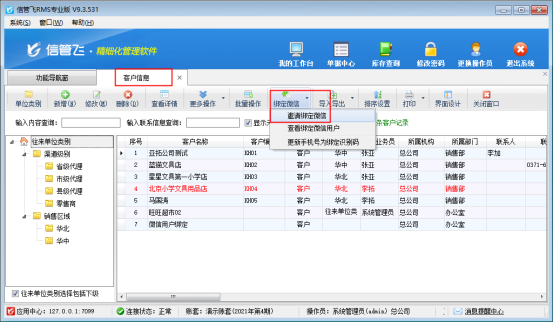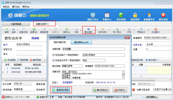 推送微信消息接收人員支持推送給業務員、客戶,業務員和客戶綁定操作支持在基礎資料“客戶信息”和“員工信息”中獲取綁定二維碼發送綁定,也可以直接開單界面“更多操作”下發送微信消息處點擊邀請客戶綁定微信,獲取綁定二維碼發送客戶進行綁定,如下圖所示: