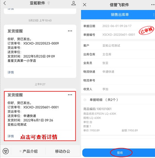 設置微信消息發送配置以及綁定好客戶或者業務員后,開單發送微信消息,客戶可在關注的微信公眾號平臺上接收到微信消息,點擊接收消息可查看開單詳情(可電腦界面設計配置外部客戶可查看內容),客戶收到貨后可微信上進行簽收操作,簽收完成后軟件開單界面的附件資料中可查看到客戶的簽字信息。如下圖所示: