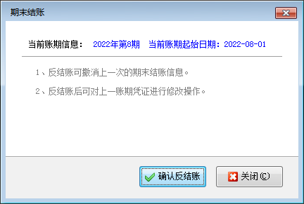 反結(jié)賬:在工具欄中點(diǎn)擊“反結(jié)賬”按鈕,軟件彈出期末結(jié)賬窗口,在提示窗口中點(diǎn)“確認(rèn)反結(jié)賬”按鈕,軟件將執(zhí)行反結(jié)賬操作,反結(jié)賬到上個(gè)賬期。