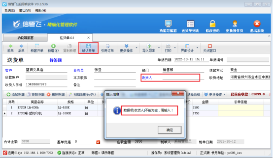 以送貨單軟件為例,示范下如何設置開單收貨人允許為空。送貨單界面設置收貨人是必填項,正常開送貨單,未在單據主體中輸入“收貨人”,商品輸入完成后點擊確認開單按鈕,會提示“收貨人不能為空”,如下圖1所示: