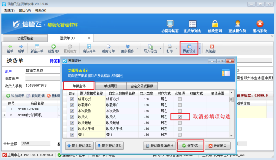 在送貨單開單界面—》界面設計,單據主體,在必填項找到“收貨人”數據項,把必填項的勾選符號去掉,然后保存,如圖2所示:
