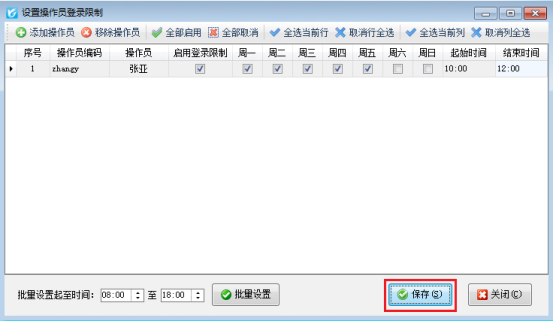 可以對操作員設置每周一至周日之間可以登錄的范圍,勾選則表示有登錄權限。可以自定義設置操作員登錄軟件的起始時間和結束時間,本次我們設置操作員“張亞”登錄時間是每周一至周五的10:00—12:00,然后點擊“保存”,如下圖所示。