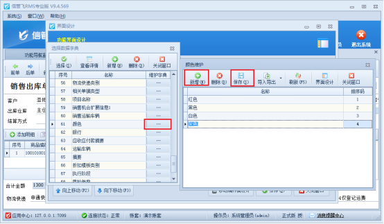 在功能導航欄點擊銷售管理---打開銷售出庫單,在開單界面點擊界面設計,勾選擴展信息并自定義列名為“顏色”,取值方式選擇“數據字典”,如圖所示: