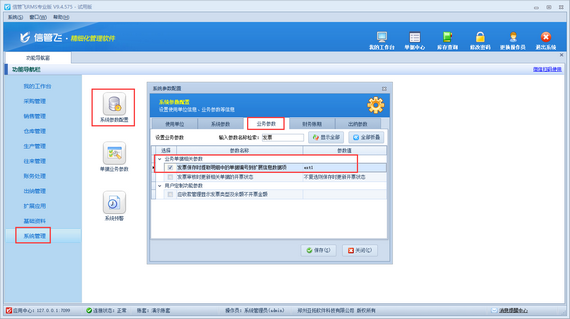 在功能導航窗選擇“系統管理”—》“系統參數配置”—》“業務參數”,進入業務參數設置界面,在“業務單據相關參數”中勾選“發票保存時提取明細中的單據編號到擴展信息數據項”參數,并設置參數值,默認為ext1(擴展信息1),然后保存參數配置,如下圖所示。