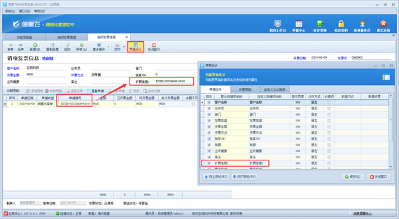 參數配置完成后,在功能導航窗點擊“往來管理”—》“銷項發票管理”打開銷項發票管理界面,點擊“新增發票”按鈕打開新增銷項發票界面,工具欄點擊“界面設計”將“單據主體.擴展信息1”勾選顯示出來,然后填開發票保存后,發票關聯的銷售單單據編號即可自動提取到“單據主體.擴展信息1”數據項內顯示,如下圖所示。