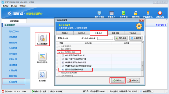 功能導航欄點擊“系統管理”-》“系統參數配置”,進入系統參數配置界面,業務參數界面會計憑證相關參數下勾選參數“顯示財務處理輔助單據”,勾選之后點擊保存。