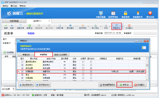 注:新開送貨單頁面默認成本單價及成本金額是不顯示的,可以在“界面設計—》“單據明細”中把“成本單價”、“成本金額”打勾顯示出來,方便清晰的看到成本價及成本金額。